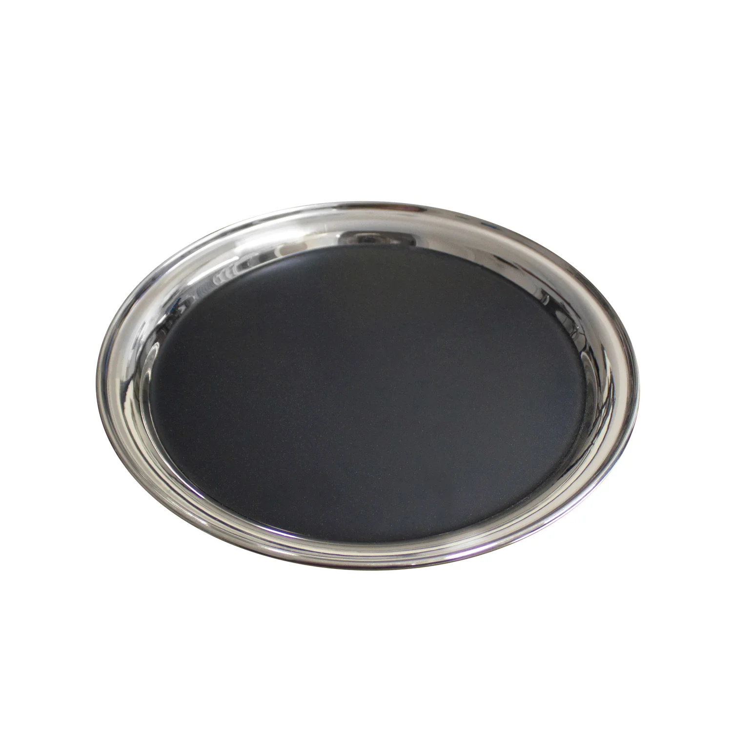 S6120Stilren barbricka i blankpolerad metall med en svart vinylmatta i botten. Mattan har en sträv yta som hindrar glas och flaskor att glida runt när du bär brickan.