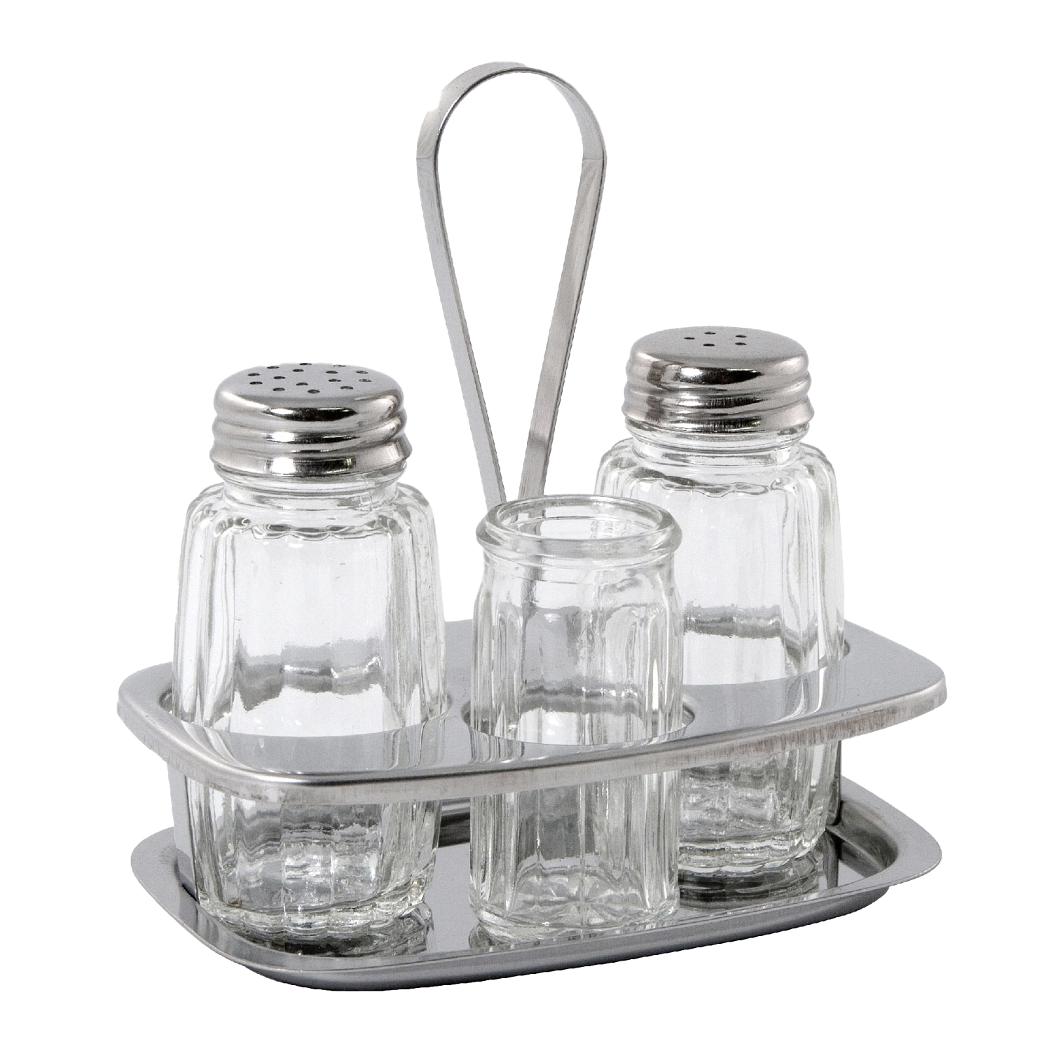 3-delat kryddställ med behållare för salt, peppar och tandpetare. Behållare i glas och lock i rostfritt stål.