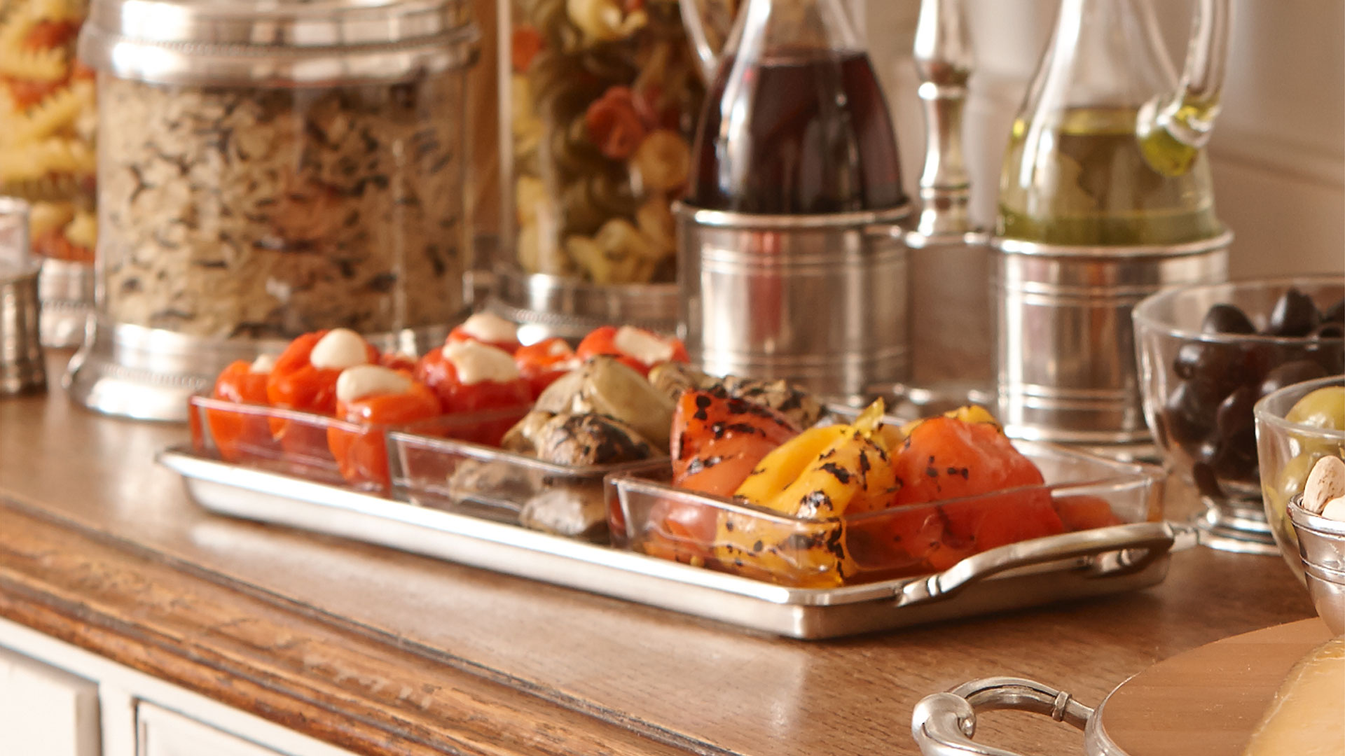 S5452Bricka med tre stycken glasfat, 29×13,5cm. Tillverkad för hand i tenn av Italienska tenntillverkare sedan 1954.