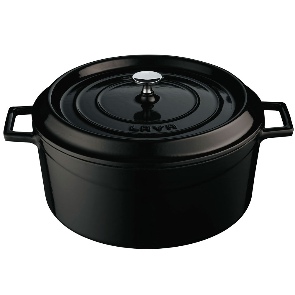 Gjutjärnsgryta 6,7 liter med svart emaljerad utsida och svart rå insida. Lock med knopp i rostfritt stål.
