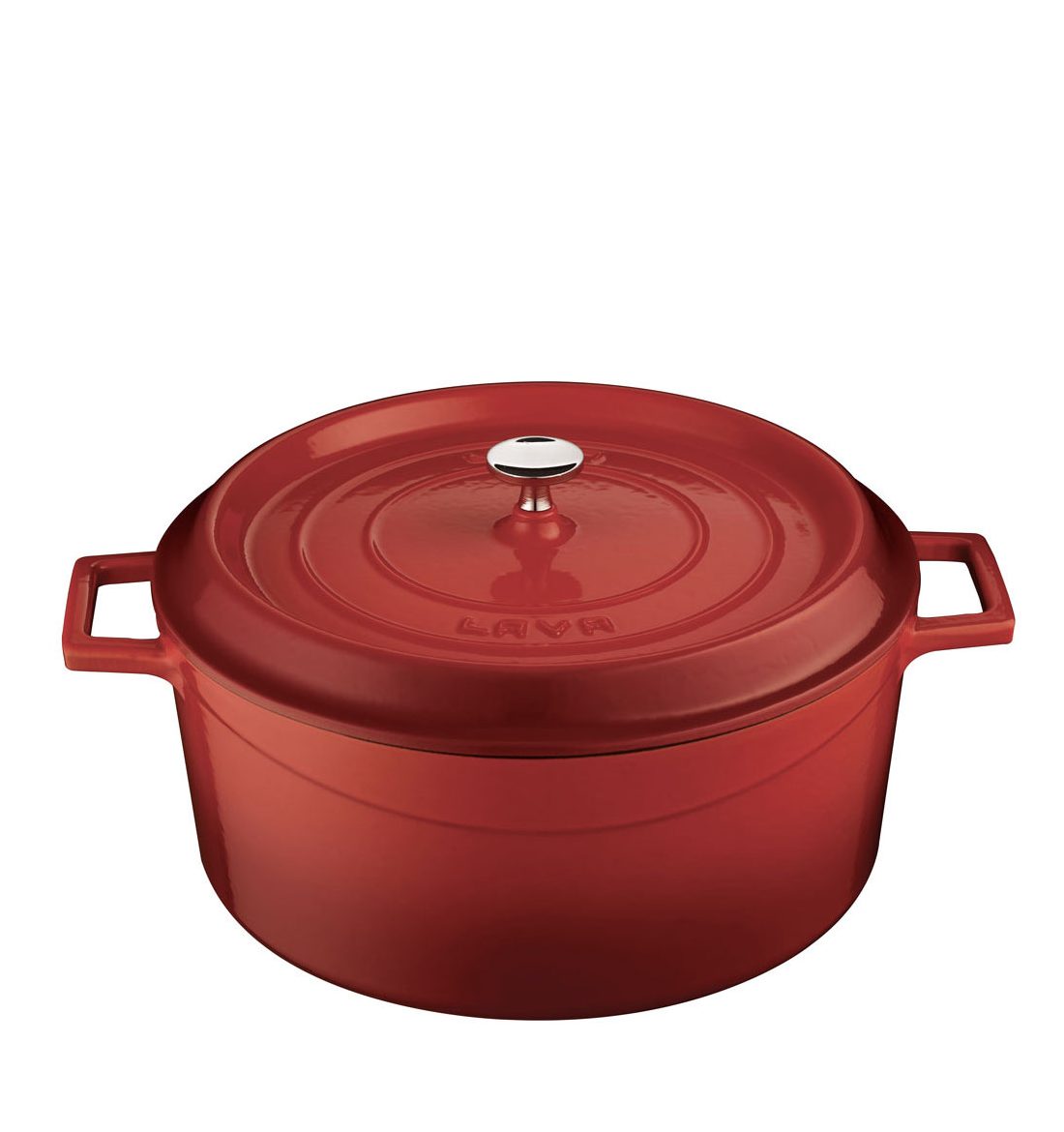 Gjutjärnsgryta 6,7 liter med röd emaljerad utsida och svart rå insida. Lock med knopp i rostfritt stål.