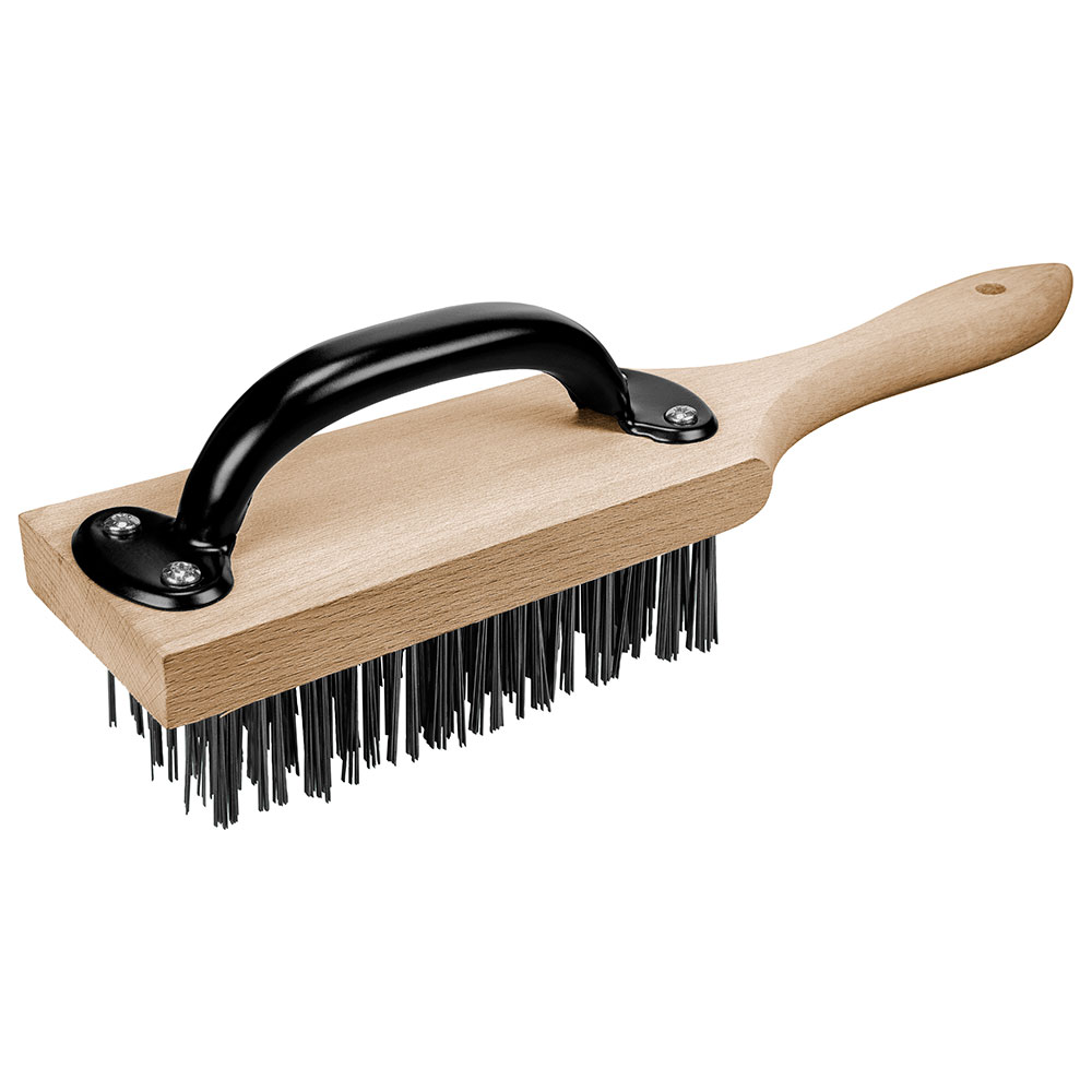 Huggblocksborste med dubbla handtag. Ett optimalt köksredskap för att hålla rent galler, stekbord och andra köksredskap. En rejäl och robust huggblocksborste med stålborste som förenklar arbetet i det professionella köket.