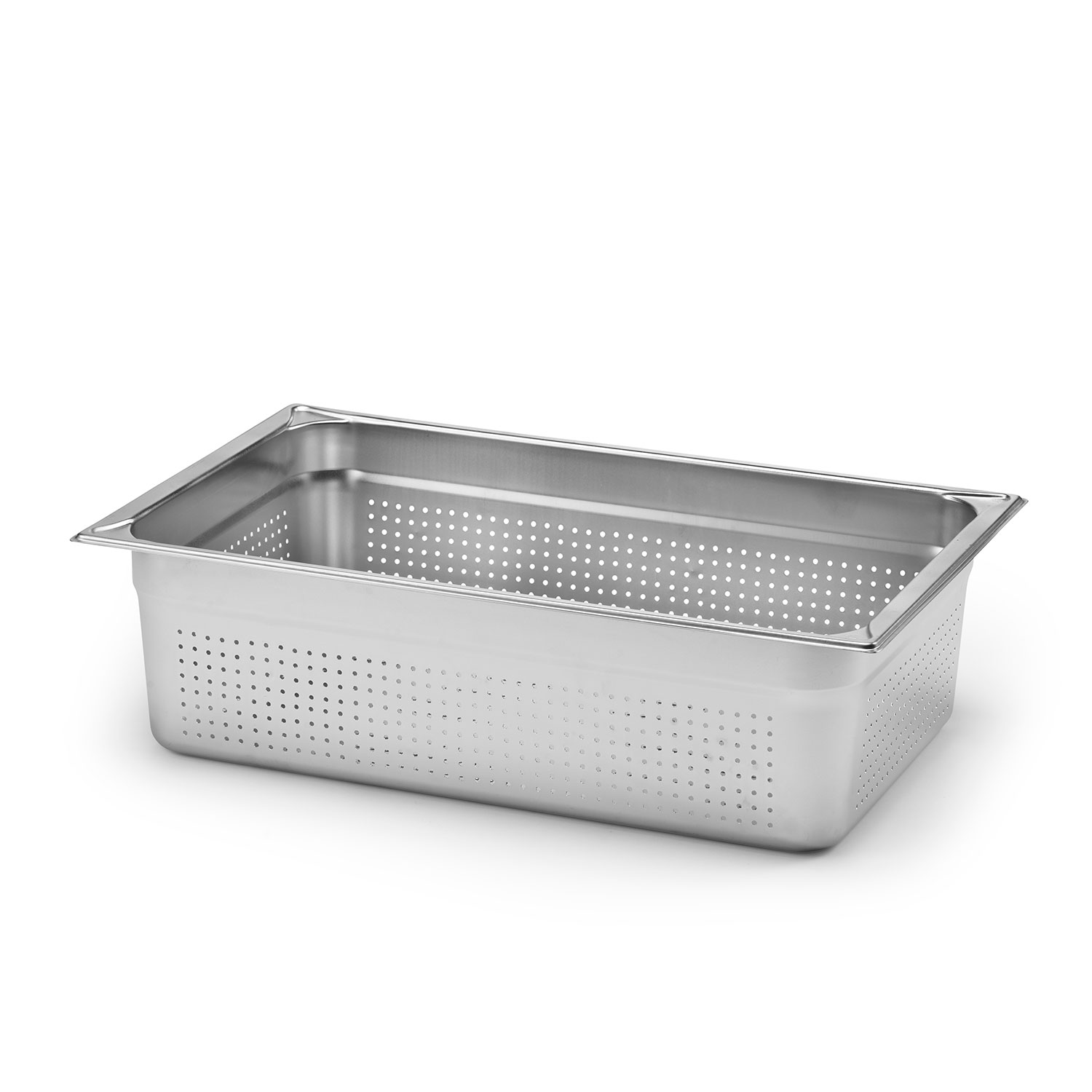 Perforerad kantin tillverkad av rostfritt stål 18/10 från Kawasaki steel / japan. Förstärkta hörn för att minska ”hundöron” och kantskador. Kantinen är staplingsbar utan att kila fast. Tillverkad enligt EN631-1 Gastronorm standard. GN inom matlagning och kökutrustning står för Gastronorm. Gastronorm är en standard som används över hela världen för att standardisera mått och storlekar på bland annat formar, lådor och fat som används i restaurangkök och storkök. GN-standarderna gör hanteringen och förvaringen av mat enkel samt underlättar planeringen av matlagning och servering.