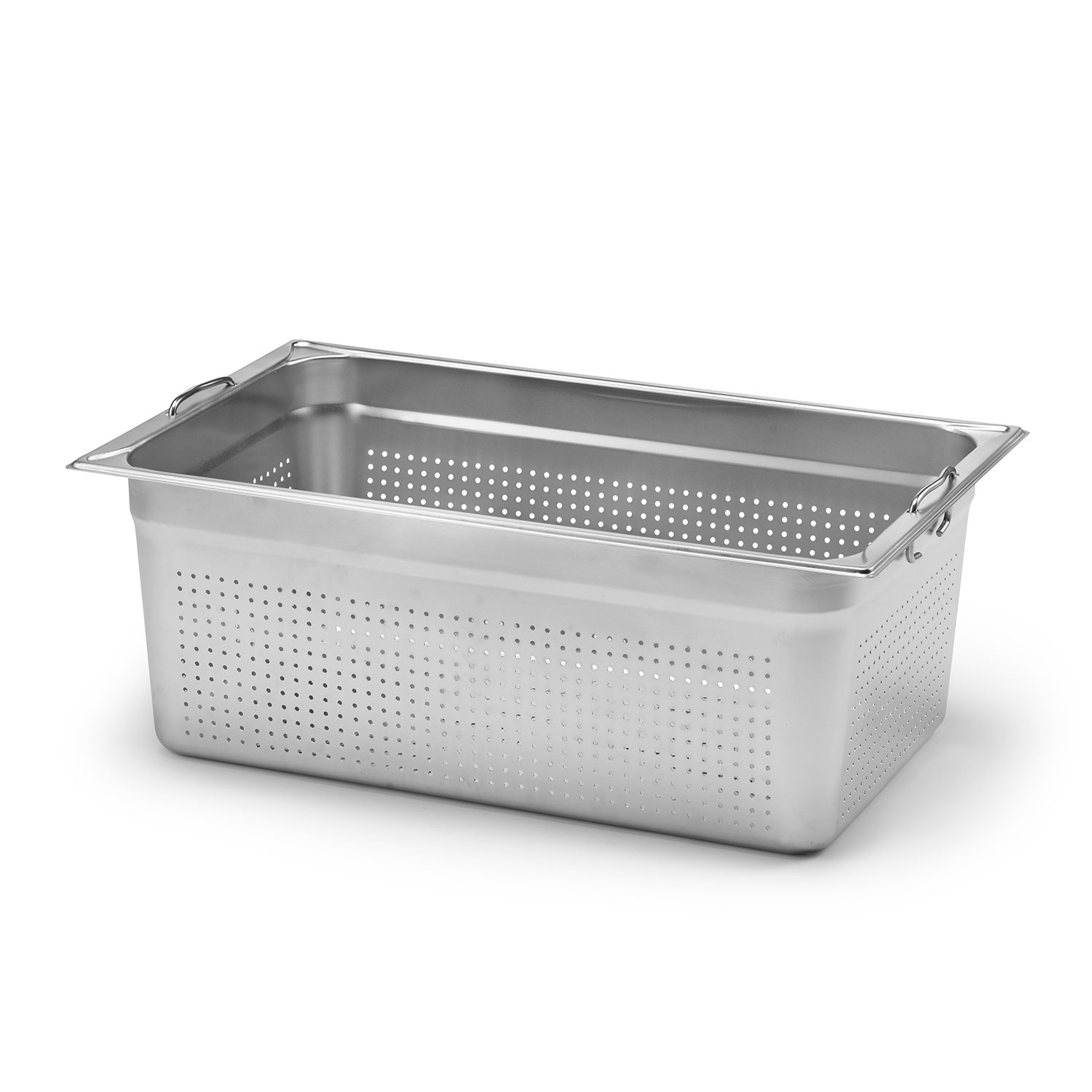 Perforerad kantin tillverkad av rostfritt stål 18/10 från Kawasaki steel / japan. Förstärkta hörn för att minska ”hundöron” och kantskador. Handtagen är fällbara och kantinen är staplingsbar utan att kila fast. Tillverkad enligt EN631-1 Gastronorm standard. GN inom matlagning och kökutrustning står för Gastronorm. Gastronorm är en standard som används över hela världen för att standardisera mått och storlekar på bland annat formar, lådor och fat som används i restaurangkök och storkök. GN-standarderna gör hanteringen och förvaringen av mat enkel samt underlättar planeringen av matlagning och servering.