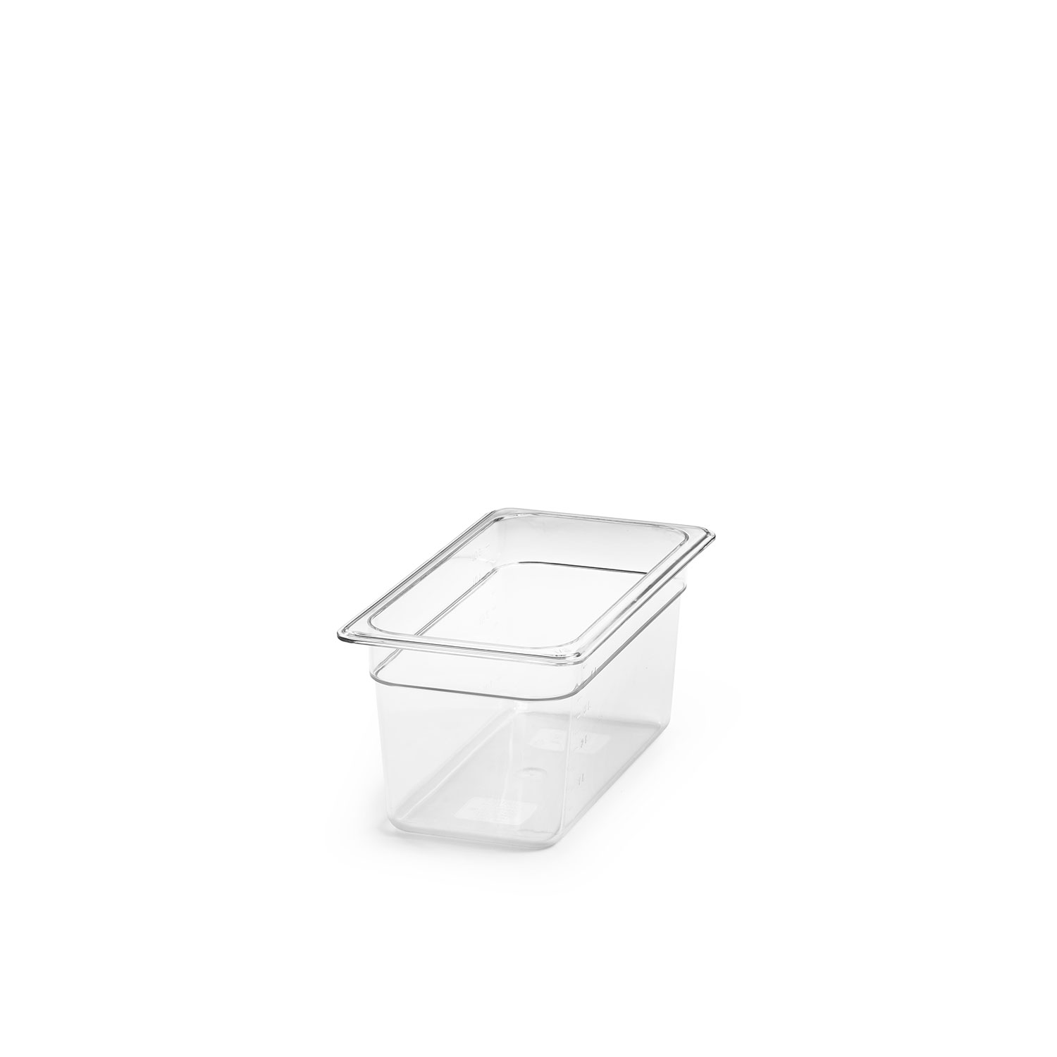 Kantin tillverkad av polykarbonatplast. Kantinen är staplingsbar utan att kila fast. Tillverkad enligt EN631-1 Gastronorm standard.Inom GN-systemet finns det flera vanliga storlekar som används för att standardisera köksutrustning och matbehållare. Här är några av de vanligaste storlekarna inom GN: