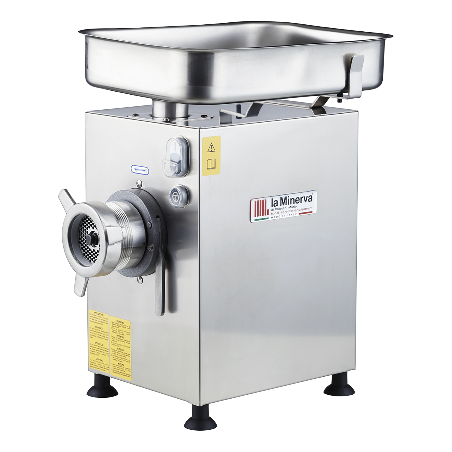 Kraftfull köttkvarn från La Minerva. 5-delat ungersystem bestående av två knivar och tre hålskivor. Maler på ett kraftfullt sätt även de lite tuffare köttbitarna med senor och kraftiga muskler utan att för den del värma upp köttet. Slutskiva på 4,5mm ingår, för att få precis den färsen du önskar går det att köpa till hålskivor i olika storlekar.