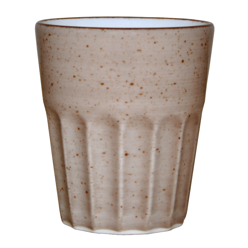 P6242Räfflad beige mugg utan öra med bruna prickar och brun rand. Stapelbar, tål mikrovågsugn, diskmaskin och frys.