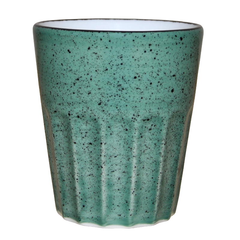 P6243Räfflad grön mugg utan öra med bruna prickar och brun rand. Stapelbar, tål mikrovågsugn, diskmaskin och frys.