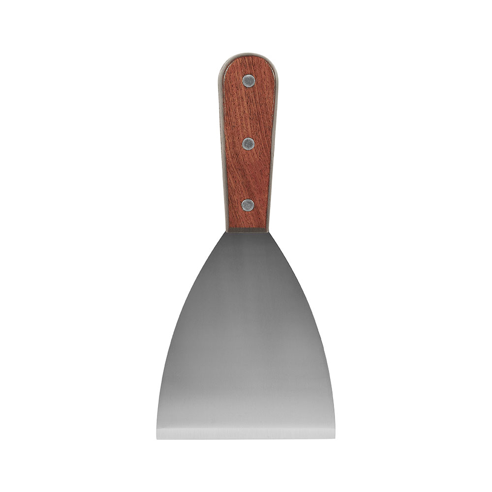 Stekbordsskrapa tillverkad i rostfritt 18/0 stål. Handtaget är av SAPELE trä som har en skyddande lack över för att den skall klara diskmaskin. En stark och hållbar stekbordsskrapa som underlättar rengöringen.