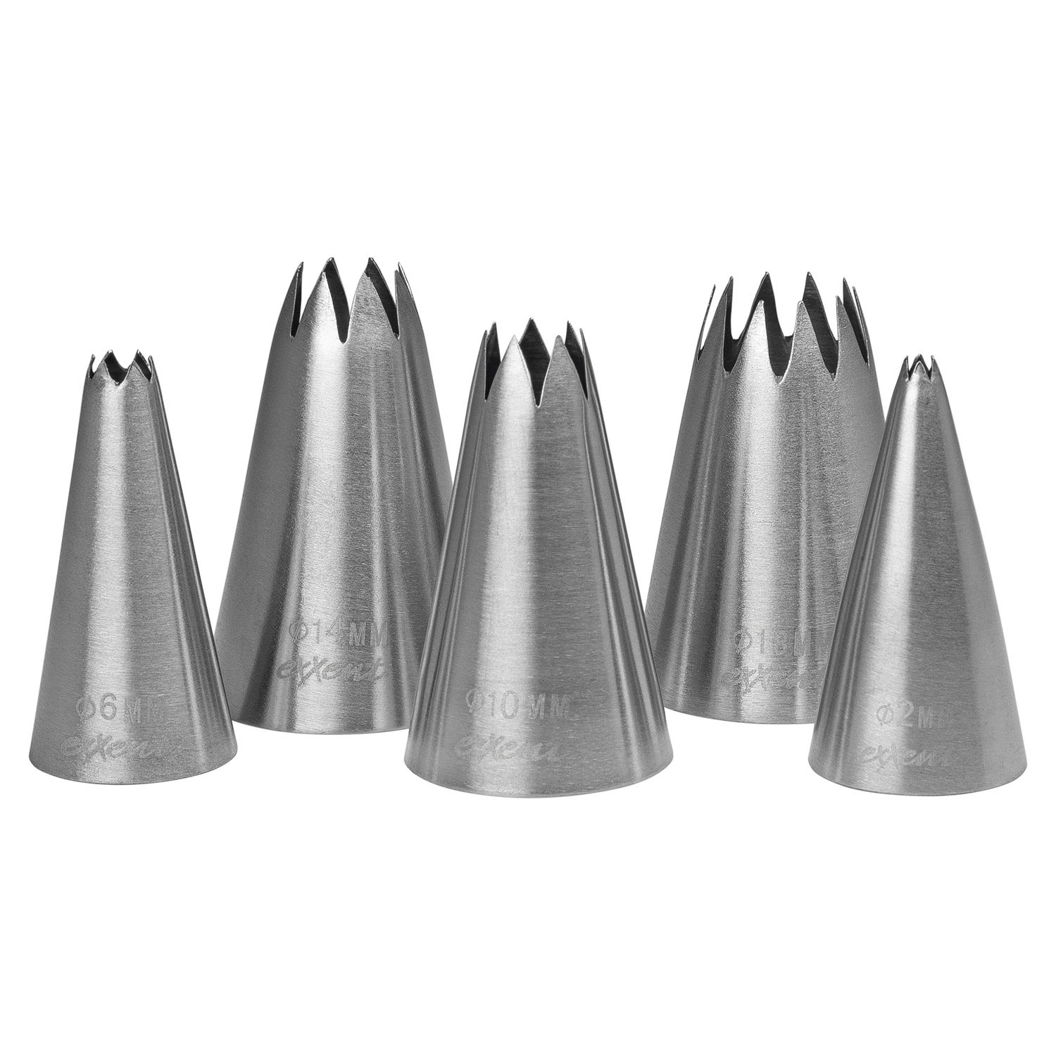 Klassiskt stjärntyllset i rostfritt stål från Exxent. Perfekt för garnering och spritsning av rätter och bakverk. Set om 5 stycken med öppning på Ø 2, 6, 10, 14 samt 18 mm.