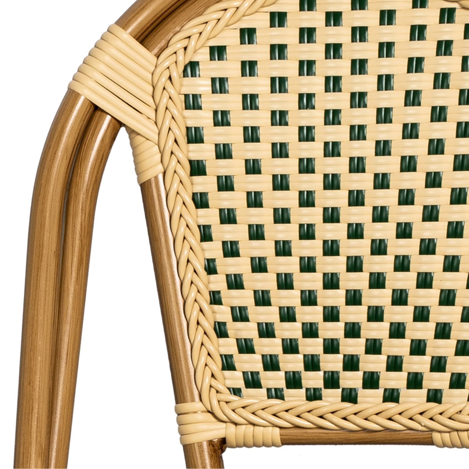 Stol Paris är många caféer och restaurangers förstahandsval. Det är inte svårt att förstå varför. Ramen är uppbyggd av en aluminiumstomme på Ø 28 mm, enkel att hantera och stapla, utan att ta upp för mycket utrymme. Sits och rygg är gjorda av grön/creme-färgad fiberrotting.