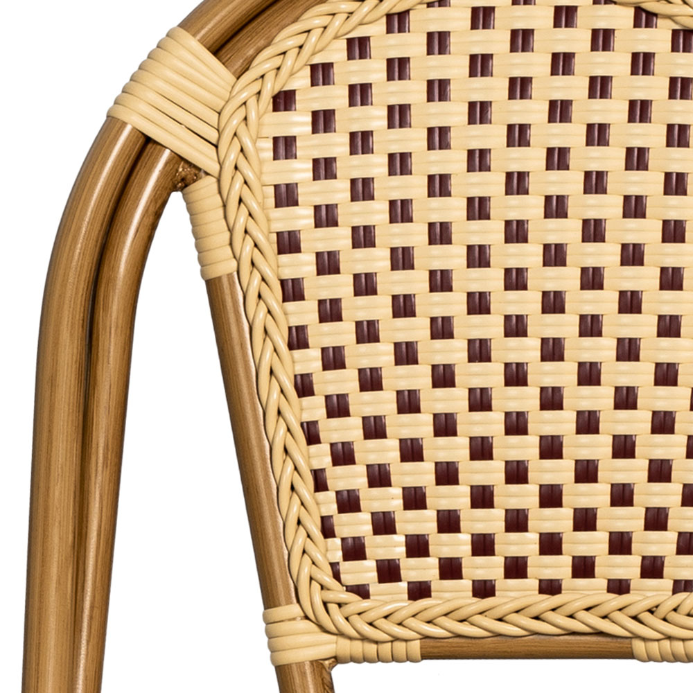 I-78667Stol Paris är många caféer och restaurangers förstahandsval. Det är inte svårt att förstå varför. Ramen är uppbyggd av en aluminiumstomme på Ø 28 mm, enkel att hantera och stapla, utan att ta upp för mycket utrymme. Sits och rygg är gjorda av vinröd/creme-färgad fiberrotting. .