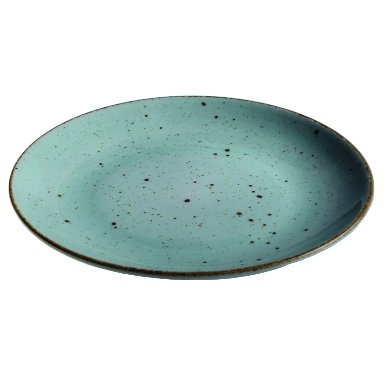 Handmålad tallrik i turkost med bruna prickar. Stapelbar, tål mikrovågsugn, diskmaskin och frys.