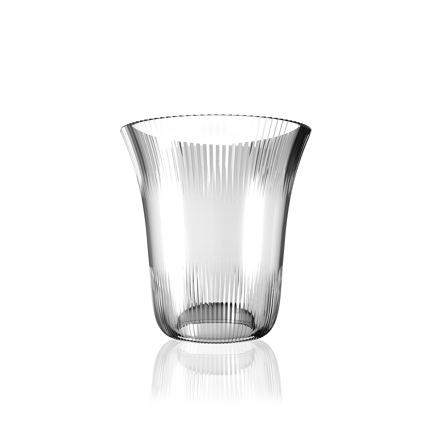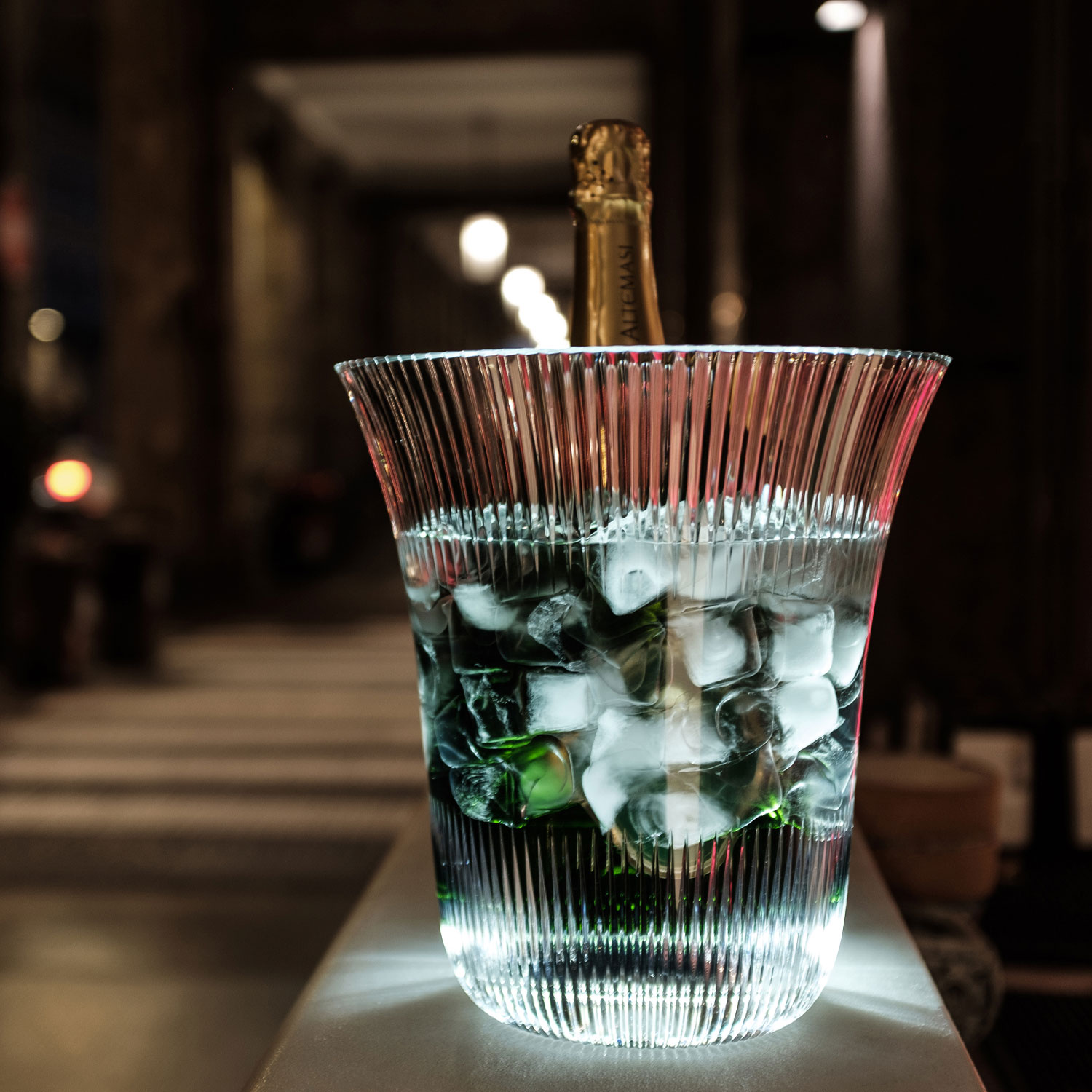 Vinkylare från italienska Italesse i en banbrytande design med en strukturerad yta som påminner om traditionellt skuren kristall. Vinkylaren har en uppladdningsbar LED-bas som lyser upp isen och flaskan den innehåller. Passar för en vin- eller champagneflaska eller burkar och mindre flaskor